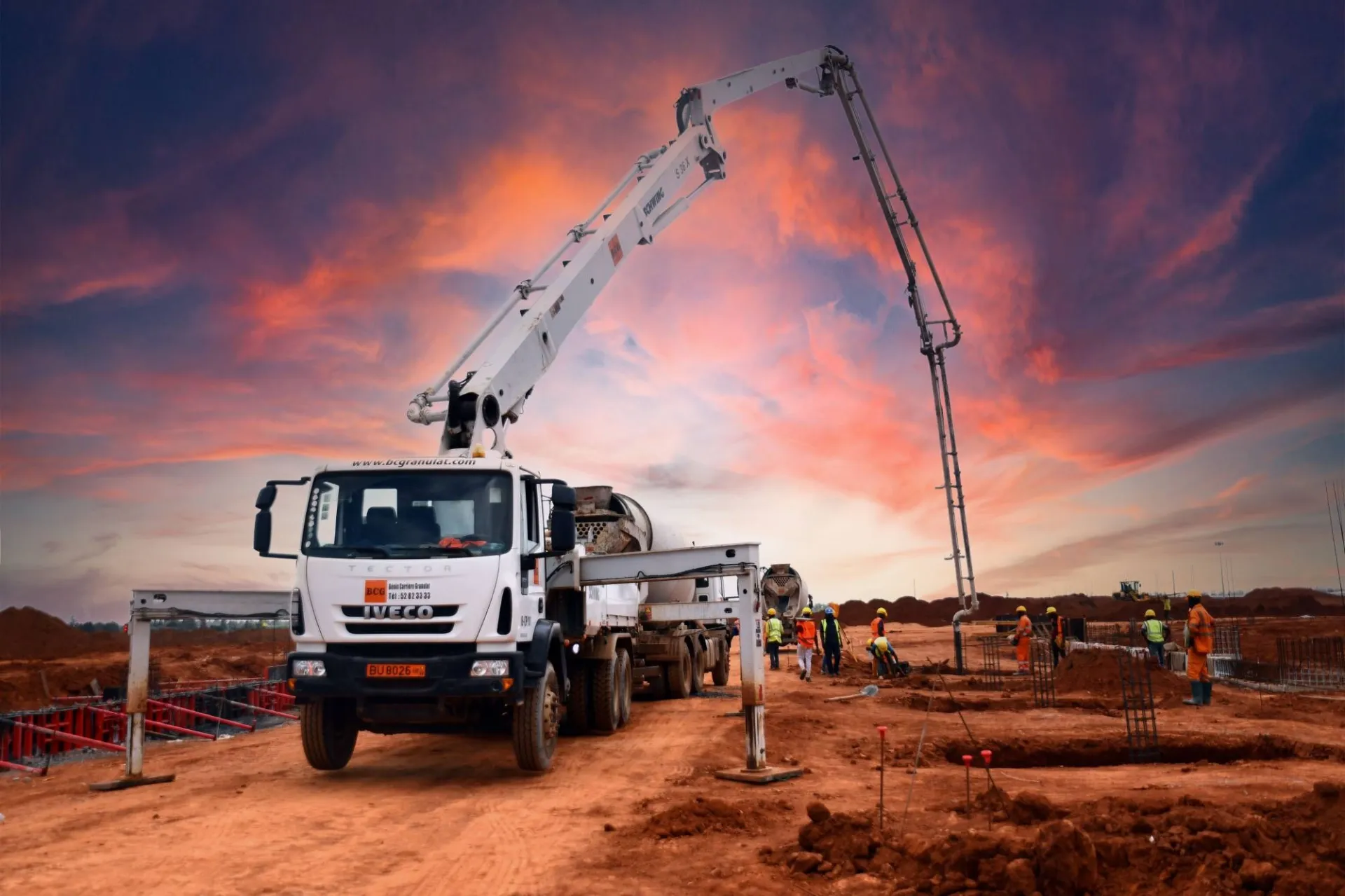 - Béton Prêt à l'Emploi (BPE) : Nos centrales à béton, idéalement situées, nous permettent de livrer dans un large périmètre à Abomey-Calavi, à Cotonou, à Porto-Novo et alentours. Notre flotte est composée de 16 camions malaxeurs (toupies) et 2 camions pompe à béton (36 et 47 mètres).